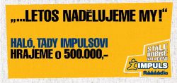 Rádio Impuls, nejposlouchanější rádio v republice, se rozhodlo udělat svým posluchačům před vánočními svátky radost a bude nadělovat. A ne málo! Na Mikuláše, v pátek 5.12.2008, jeden šťastný posluchač vyhraje v oblíbené soutěži Haló, tady Impulsovi speciální prémii ve výši 500.000 Kč. Pro získání této speciální prémie se stačí zaregistrovat do hry a pokud se vylosovaný hráč v tento den přihlásí do telefonu výherním heslem Haló, tady Impulsovi, je půl milionu jeho. Již není třeba zodpovídat žádné doplňující otázky.