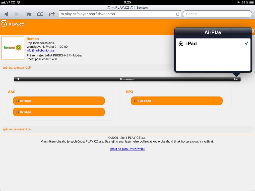 Apple před 14ti dny uvolnil první (a minulý týden i druhou) beta verzi iOS 4.3, která přináší podporu pro AirPlay i pro aplikace třetích stran. Mobilní verze portálu PLAY.CZ (http://m.play.cz) tuto změnu reflektuje a na zařízeních Apple s iOS 4.3 by měla AirPlay plně podporovat. Bohužel ale nemáme k dispozici žádné zařízení s podporou AirPlay, na které bychom mohli audio stream poslat – pokud někdo již máte iOS 4.3 a AirPlay kompaktibilní „příjimač“, budema rádi za informaci jestli to funguje nebo ne.