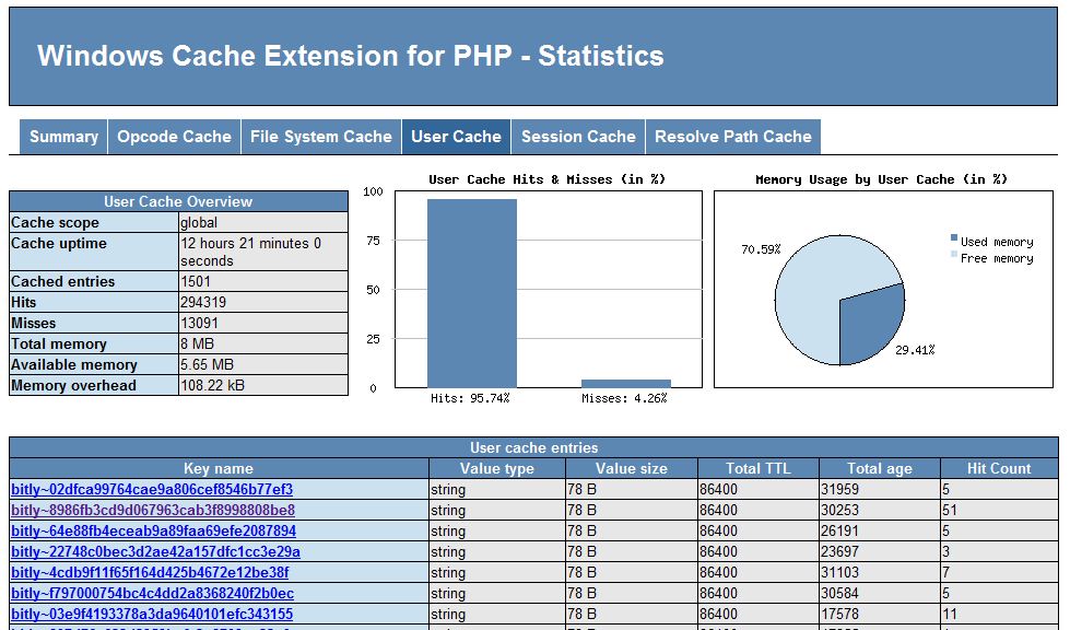 Druhým souborem, který najdete ve staženém archivu, je wincache.php. Je to velmi zajímavý script, který není radno zpřístupnit široké veřejnosti… Slouží k prohlížení statistik WinCache. Vidíte tam například jak moc je cache obsazena. Vidíte i přehled uložených dat a další spousty zajímavých statistik.